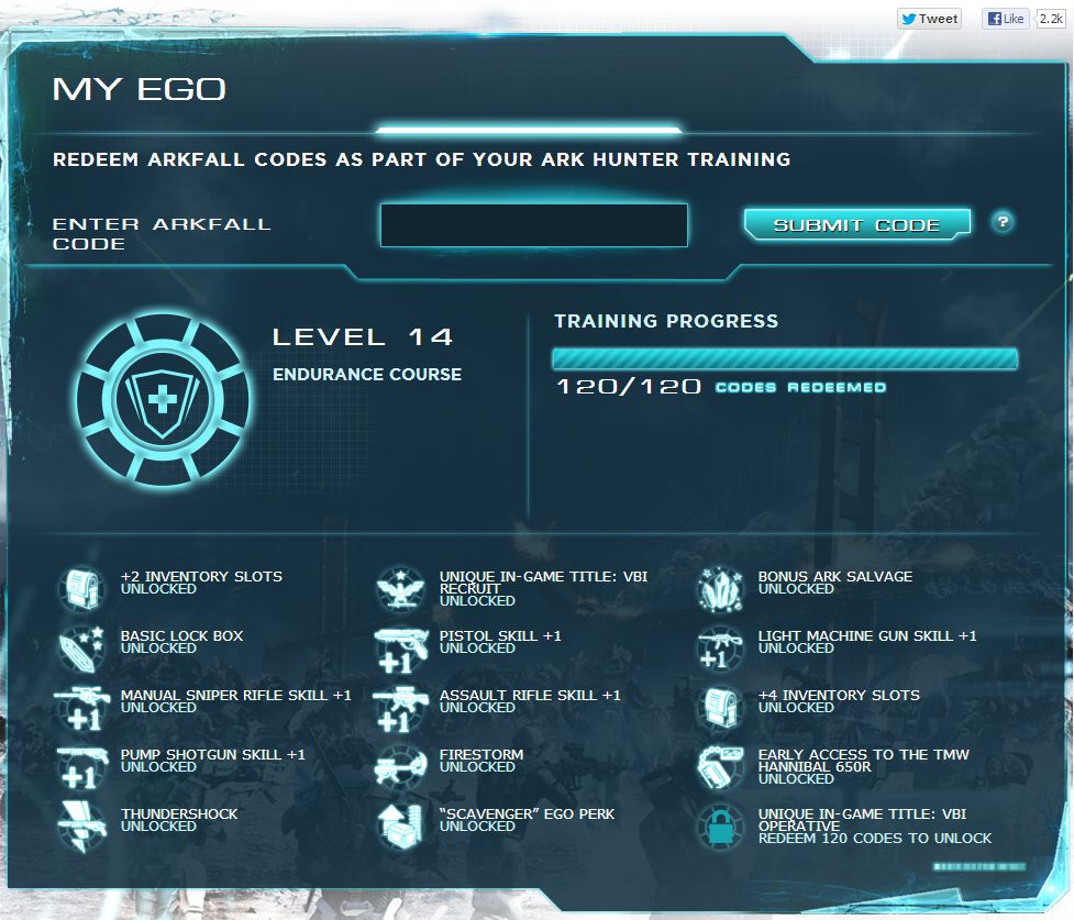 I don't know what going on here, but My EGO seems to be broken. I have redeemed all 132 codes, however it only says I have redeemed 120/120 and to make it worse it still lists me as Level 14 (not 15) and has not unlocked the 120 code reward...