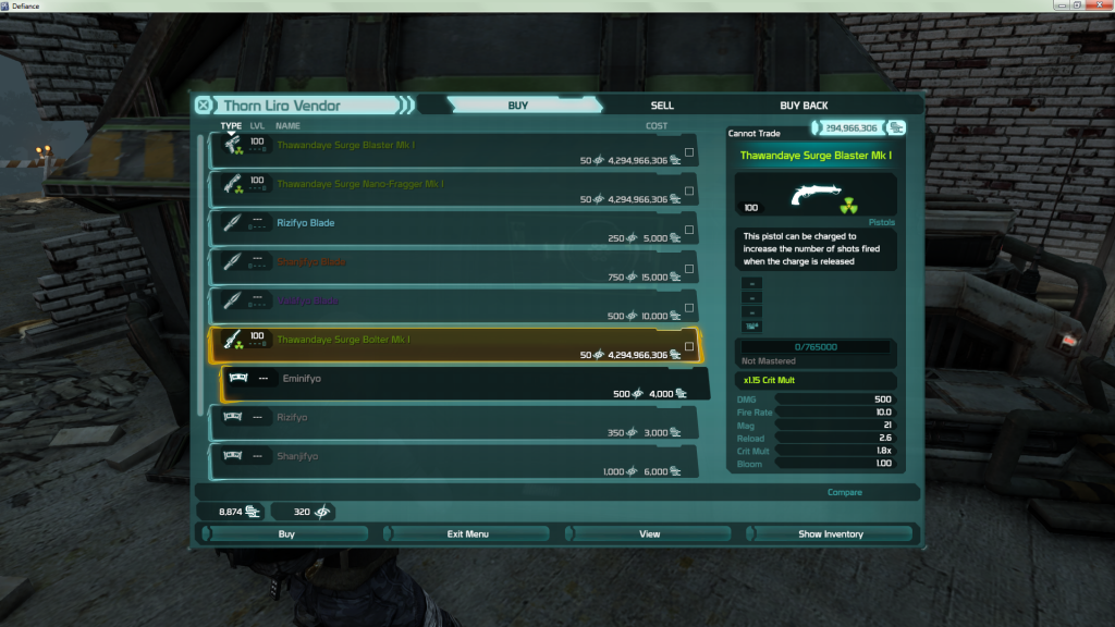 At 250 EGO a Blue option of the weapons becomes available for normal prices (100 tokens and 525 scrip) - the greens are still 4 billion.